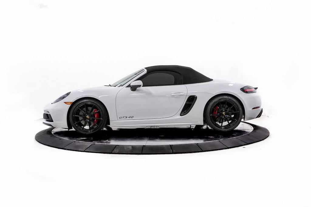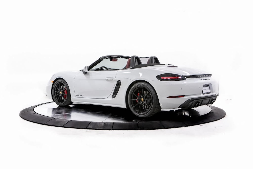 Porsche Certified, 14-Way Power Sport Seats, 4-Wheel Disc Brakes, 6 Speakers, ABS brakes, Adaptive suspension, Air Conditioning, Alloy wheels, AM/FM radio: SiriusXM, Apple CarPlay, Auto-dimming door mirrors, Auto-dimming Rear-View mirror, Automatic temperature control, BOSE Surround Sound System, Brake assist, Bumpers: body-color, CD player, Convertible roof lining, Convertible roof wind blocker, Delay-off headlights, Deletion of Race-Tex, Driver door bin, Driver vanity mirror, Dual front impact airbags, Dual front side impact airbags, DVD-Audio, Electronic Stability Control, Exterior Parking Camera Rear, Four wheel independent suspension, Front anti-roll bar, Front Bucket Seats, Front Center Armrest, Front dual zone A/C, Front reading lights, Fuel Cap w/Aluminum Look Finish, Fully automatic headlights, Garage door transmitter: HomeLink, Glass rear window, Headlight cleaning, Heated 2-Way Sport Seats Plus, Heated door mirrors, Heated front seats, Heated Multifunction Steering Wheel, High intensity discharge headlights: Bi-Xenon, Illuminated entry, Integrated roll-over protection, Interior Trim in Black Brushed Aluminum w/Leather, Knee airbag, Lane Change Assist (LCA), LED Headlights w/Porsche Dynamic Light System Plus, Light Design Package, Low tire pressure warning, Luggage Net in Passenger Footwell, Memory Package, Navigation w/Porsche Connect, Occupant sensing airbag, Outside temperature display, Overhead airbag, Passenger door bin, Passenger vanity mirror, Porsche Communication Management, Porsche Entry & Drive, Power convertible roof, Power door mirrors, Power driver seat, Power Folding Exterior Mirrors, Power passenger seat, Power steering, Power Steering Plus, Power windows, Premium Package, Race-Tex Seat Trim, Radio data system, Rain sensing wipers, Rear anti-roll bar, Rear window defroster, Remote keyless entry, Security system, Speed control, Spoiler, Sport steering wheel, Steering Wheel & Gear Lever in Leather, Tachometer, Telescoping steering wheel, Tilt steering wheel, Traction control, Trip computer, Variably intermittent wipers, Ventilated Seats, Wheels: 20 718 Sport in Satin Black. White 2022 Porsche 718 Boxster GTS GTS RWD 7-Speed Porsche Doppelkupplung (PDK) 4.0L H6 DOHC 24V LEV3-LEV160 394hp