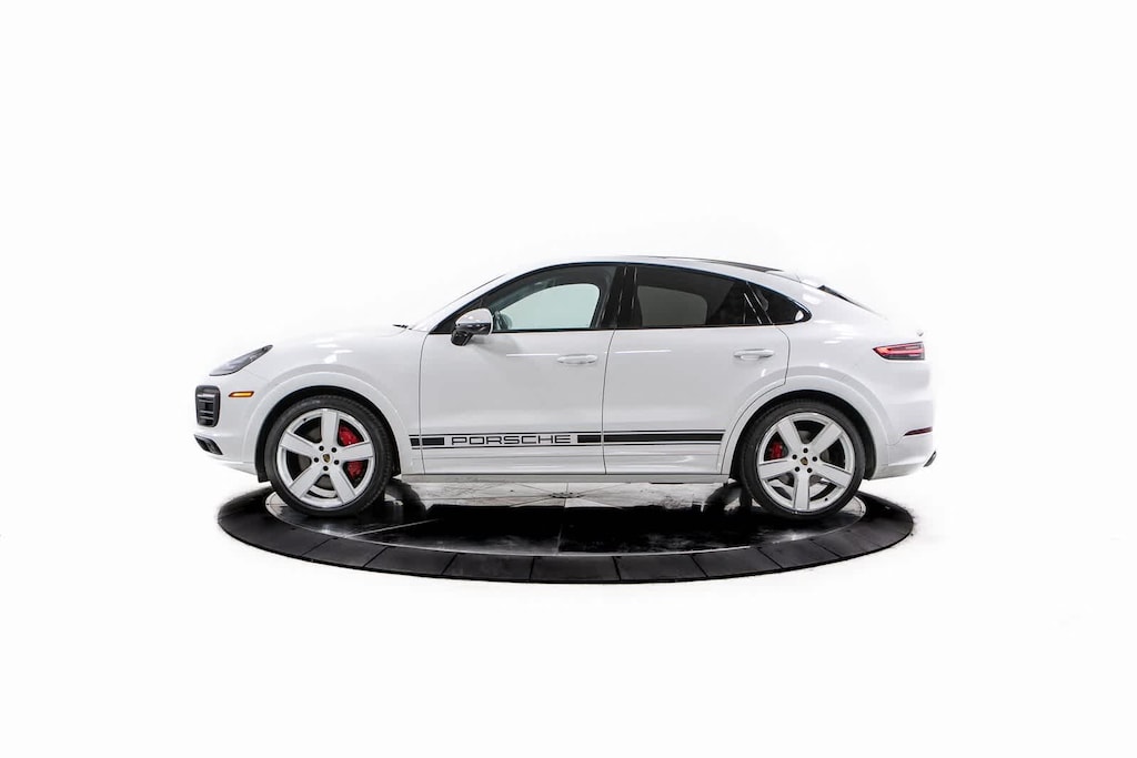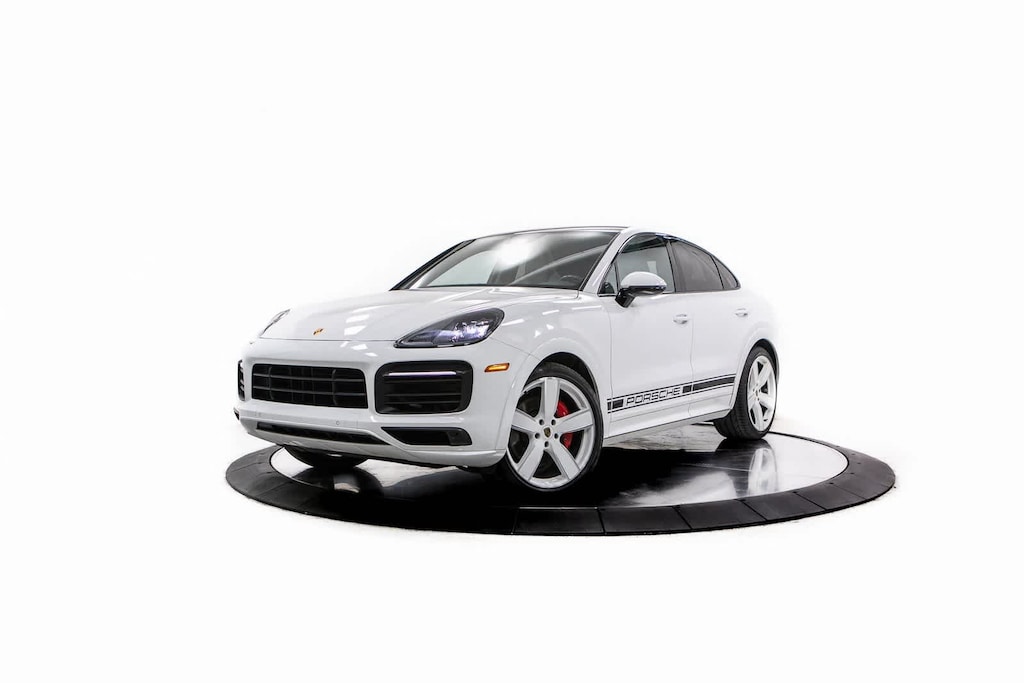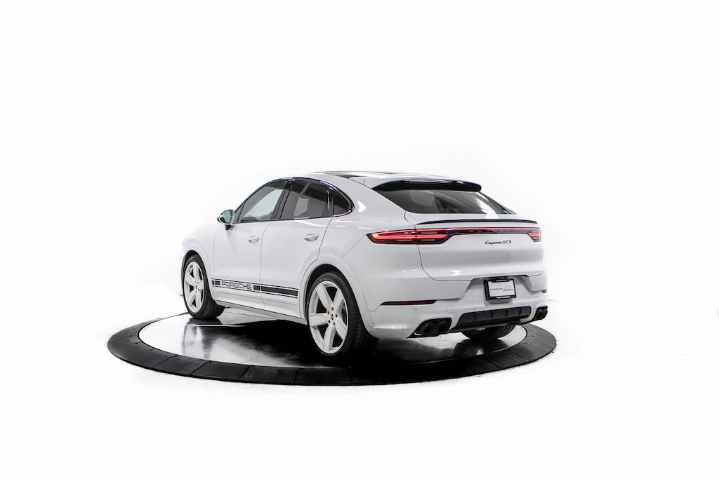 Porsche Certified, 10 Speakers, 4-Wheel Disc Brakes, ABS brakes, Adaptive suspension, Air Conditioning, Alloy wheels, AM/FM radio: SiriusXM, Apple CarPlay, Auto-leveling suspension, Automatic temperature control, Axle Ratio: TBD, Brake assist, Bumpers: body-color, Delay-off headlights, Driver door bin, Driver vanity mirror, Dual front impact airbags, Dual front side impact airbags, Electronic Stability Control, Exterior Parking Camera Rear, Four wheel independent suspension, Front anti-roll bar, Front Bucket Seats, Front Center Armrest, Front dual zone A/C, Front reading lights, Fully automatic headlights, Garage door transmitter: HomeLink, GTS 8-Way Power Sport Seats, Heated door mirrors, Illuminated entry, Knee airbag, Leather Seat Trim w/GTS Package in Race-Tex, Leather Shift Knob, Low tire pressure warning, Navigation System, Occupant sensing airbag, Outside temperature display, Overhead airbag, Overhead console, Panic alarm, Passenger door bin, Passenger vanity mirror, Porsche Communication Management, Power door mirrors, Power driver seat, Power Liftgate, Power passenger seat, Power steering, Power windows, Radio data system, Rain sensing wipers, Rear anti-roll bar, Rear fog lights, Rear reading lights, Rear seat center armrest, Rear side impact airbag, Rear window defroster, Remote keyless entry, Security system, Speed control, Speed-sensing steering, Split folding rear seat, Spoiler, Steering wheel mounted audio controls, Tachometer, Telescoping steering wheel, Tilt steering wheel, Traction control, Trip computer, Turn signal indicator mirrors, Variably intermittent wipers, Voltmeter, Wheels: 21 RS Spyder Design in Satin Black. White 2023 Porsche Cayenne Coupe GTS GTS AWD 8-Speed Automatic with Tiptronic 4.0L V8