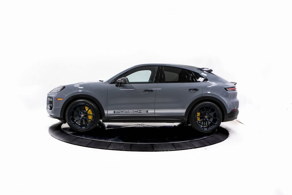 Porsche Certified, 14 Speakers, 4-Wheel Disc Brakes, 8-Way Sport Seats, ABS brakes, Adaptive suspension, Air Conditioning, Alloy wheels, AM/FM radio: SiriusXM w/360L, Apple CarPlay & Android Auto, Audio memory, Auto High-beam Headlights, Auto-dimming door mirrors, Auto-dimming Rear-View mirror, Auto-leveling suspension, Automatic temperature control, Brake assist, Bumpers: body-color, Ceramic disc brakes: front and rear, Compass, Delay-off headlights, Driver door bin, Driver vanity mirror, Dual front impact airbags, Dual front side impact airbags, Electronic Stability Control, Exterior Parking Camera Rear, Four wheel independent suspension, Front anti-roll bar, Front Bucket Seats, Front Center Armrest, Front dual zone A/C, Front reading lights, Fully automatic headlights, Garage door transmitter: HomeLink, Heated door mirrors, Heated front seats, Heated rear seats, Heated steering wheel, HVAC memory, Illuminated entry, Knee airbag, Leather/Race-Tex Seat Trim w/Deviated Stitching, Low tire pressure warning, Memory seat, Navigation System, Occupant sensing airbag, Outside temperature display, Overhead airbag, Overhead console, Panic alarm, Passenger door bin, Passenger vanity mirror, Porsche Communication Management, Power door mirrors, Power driver seat, Power Liftgate, Power passenger seat, Power steering, Power windows, Radio data system, Rain sensing wipers, Rear anti-roll bar, Rear fog lights, Rear reading lights, Rear seat center armrest, Rear side impact airbag, Rear window defroster, Remote keyless entry, Security system, Speed control, Speed-sensing steering, Split folding rear seat, Spoiler, Sport steering wheel, Steering wheel mounted audio controls, Tachometer, Telescoping steering wheel, Tilt steering wheel, Traction control, Trip computer, Turn signal indicator mirrors, Variably intermittent wipers, Voltmeter, Wheels: 22 GT Design in Satin Neodyme. Odometer is 1229 miles below market average! Arctic Grey 2025 Porsche Cayenne Coupe Turbo GT Turbo GT AWD 8-Speed Automatic with Tiptronic V8