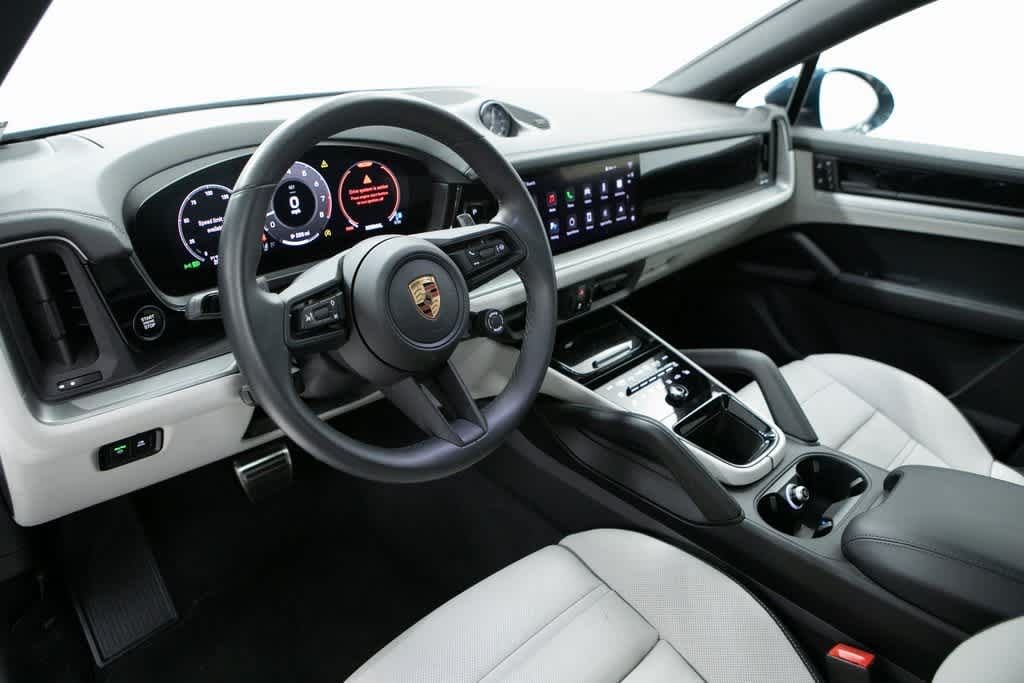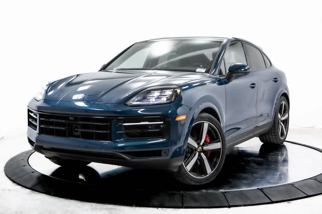 Porsche Certified, 10 Speakers, 4-Wheel Disc Brakes, 8-Way Sport Seats, ABS brakes, Adaptive suspension, Air Conditioning, Alloy wheels, AM/FM radio: SiriusXM w/360L, Apple CarPlay & Android Auto, Audio memory, Auto-dimming door mirrors, Auto-dimming Rear-View mirror, Automatic temperature control, Brake assist, Bumpers: body-color, Compass, Delay-off headlights, Driver door bin, Driver vanity mirror, Dual front impact airbags, Dual front side impact airbags, Electronic Stability Control, Exterior Parking Camera Rear, Four wheel independent suspension, Front anti-roll bar, Front Bucket Seats, Front Center Armrest, Front dual zone A/C, Front reading lights, Fully automatic headlights, Garage door transmitter: HomeLink, Heated door mirrors, Heated front seats, Heated steering wheel, HVAC memory, Illuminated entry, Knee airbag, Leather Seat Trim, Leather steering wheel, Low tire pressure warning, Memory seat, Navigation System, Occupant sensing airbag, Outside temperature display, Overhead airbag, Overhead console, Panic alarm, Passenger door bin, Passenger vanity mirror, Porsche Communication Management, Power door mirrors, Power driver seat, Power Liftgate, Power passenger seat, Power steering, Power windows, Radio data system, Rain sensing wipers, Rear anti-roll bar, Rear fog lights, Rear reading lights, Rear seat center armrest, Rear side impact airbag, Rear window defroster, Remote keyless entry, Security system, Speed control, Speed-sensing steering, Split folding rear seat, Spoiler, Steering wheel mounted audio controls, Tachometer, Telescoping steering wheel, Tilt steering wheel, Traction control, Trip computer, Turn signal indicator mirrors, Variably intermittent wipers, Voltmeter, Wheels: 20 Cayenne S in Vesuvius Grey. Montego Blue Metallic 2025 Porsche Cayenne Coupe S S AWD 8-Speed Automatic with Tiptronic V8