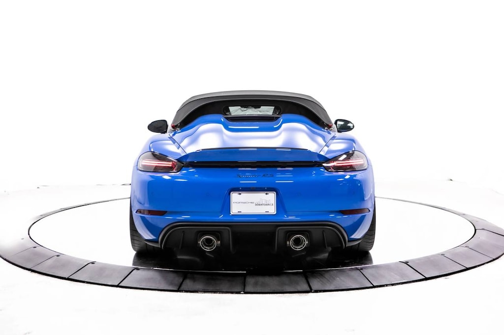 SHARK BLUE 2025 Porsche 718 Spyder RWD 7-Speed Porsche Doppelkupplung (PDK) 4.0L H6 DOHC 24V LEV3-ULEV70 493hp 4-Wheel Disc Brakes, 6 Speakers, ABS brakes, Adaptive suspension, Air Conditioning, Alloy wheels, AM/FM radio: SiriusXM, Automatic temperature control, BOSE Surround Sound System, Brake assist, Brake Calipers in High Gloss Black, Bumpers: body-color, Chrono Package, Convertible roof lining, Convertible roof wind blocker, Delay-off headlights, Deletion of SiriusXM Antenna, Driver door bin, Driver vanity mirror, Dual front impact airbags, Dual front side impact airbags, Electronic Stability Control, Exterior Parking Camera Rear, Four wheel independent suspension, Front anti-roll bar, Front Axle Lift System, Front Bucket Seats, Front Center Armrest, Front dual zone A/C, Front reading lights, Full Bucket Seats, Fully automatic headlights, Garage door transmitter: HomeLink, Glass rear window, Heated door mirrors, High intensity discharge headlights: Bi-Xenon, Illuminated Door-Sill Guards in Carbon Fiber, Illuminated entry, Integrated roll-over protection, Knee airbag, Light Design Package, Low tire pressure warning, Luggage Net in Passenger Footwell, Navigation System, Occupant sensing airbag, Outside temperature display, Overhead airbag, Passenger door bin, Passenger vanity mirror, Porsche Ceramic Composite Brakes, Porsche Communication Management, Power door mirrors, Power driver seat, Power passenger seat, Power steering, Power windows, Radio data system, Rear anti-roll bar, Rear window defroster, Remote keyless entry, Security system, Smoking Package, Sound Package Plus w/6 Loudspeakers, Speed control, Spoiler, Sport steering wheel, Spyder RS Top w/Accents in Deviated Color, Tachometer, Telescoping steering wheel, Tilt steering wheel, Traction control, Trip computer, Two-Tone Leather/Race-Tex Seat Trim, Variably intermittent wipers, Weissach Package, Wheels Painted in Satin Black, Wheels: 20 718 Cayman GT4 RS Forged Aluminum, Wheels: 20 718 Cayman GT4 RS Forged Magnesium.