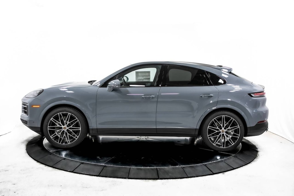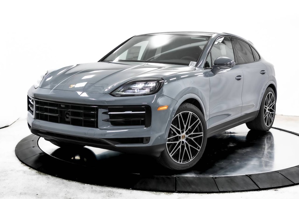 Grey 2025 Porsche Cayenne Coupe S AWD 8-Speed Automatic with Tiptronic V8 10 Speakers, 14-Way Power Seats w/Comfort Memory, 18-Way Adaptive Sport Seats Plus w/Comfort Memory, 4-Wheel Disc Brakes, 4-Zone Climate Control, 8-Way Sport Seats, ABS brakes, Adaptive Air Suspension w/PASM, Adaptive Cruise Control w/Lane Keep Assist (LKA), Adaptive suspension, Air Conditioning, Alloy wheels, AM/FM radio: SiriusXM w/360L, Apple CarPlay & Android Auto, Audio memory, Auto-dimming door mirrors, Auto-dimming Rear-View mirror, Automatic temperature control, BOSE Surround Sound System, Brake assist, Brake Calipers in High Gloss Black, Bumpers: body-color, Compass, Delay-off headlights, Driver door bin, Driver vanity mirror, Dual front impact airbags, Dual front side impact airbags, Electronic Stability Control, Exclusive Design Fuel Cap, Exclusive Design Taillights, Exterior Mirror Lower Trim & Base in Ext Color, Exterior Parking Camera Rear, Four wheel independent suspension, Front anti-roll bar, Front Bucket Seats, Front Center Armrest, Front dual zone A/C, Front reading lights, Front Ventilated Seats, Fully automatic headlights, Garage door transmitter: HomeLink, HD-Matrix Design LED Headlights, HD-Matrix Design LED Headlights in Black, Heated door mirrors, Heated front seats, Heated GT Sport Steering Wheel in Leather, Heated steering wheel, HVAC memory, Illuminated entry, Knee airbag, Leather Seat Trim, Leather steering wheel, Low tire pressure warning, Memory seat, Navigation System, Occupant sensing airbag, Outside temperature display, Overhead airbag, Overhead console, Panic alarm, Passenger door bin, Passenger vanity mirror, Porsche Communication Management, Porsche Crest on Front & Rear Headrests, Porsche Logo on Rear in High Gloss Black, Power door mirrors, Power driver seat, Power Liftgate, Power passenger seat, Power steering, Power windows, Premium Package Plus, Radio data system, Rain sensing wipers, Rear anti-roll bar, Rear Comfort Seats (2+1), Rear fog lights, Rear Heated Seats, Rear reading lights, Rear seat center armrest, Rear side impact airbag, Rear window defroster, Remote keyless entry, Security system, Speed control, Speed-sensing steering, Split folding rear seat, Spoiler, Steering wheel mounted audio controls, Tachometer, Telescoping steering wheel, Tilt steering wheel, Traction control, Trailer Hitch w/o Tow Ball, Trip computer, Turn signal indicator mirrors, Under Door Puddle Light Projectors, Variably intermittent wipers, Voltmeter, Wheels: 20 Cayenne S in Vesuvius Grey, Wheels: 22 RS Spyder Design.