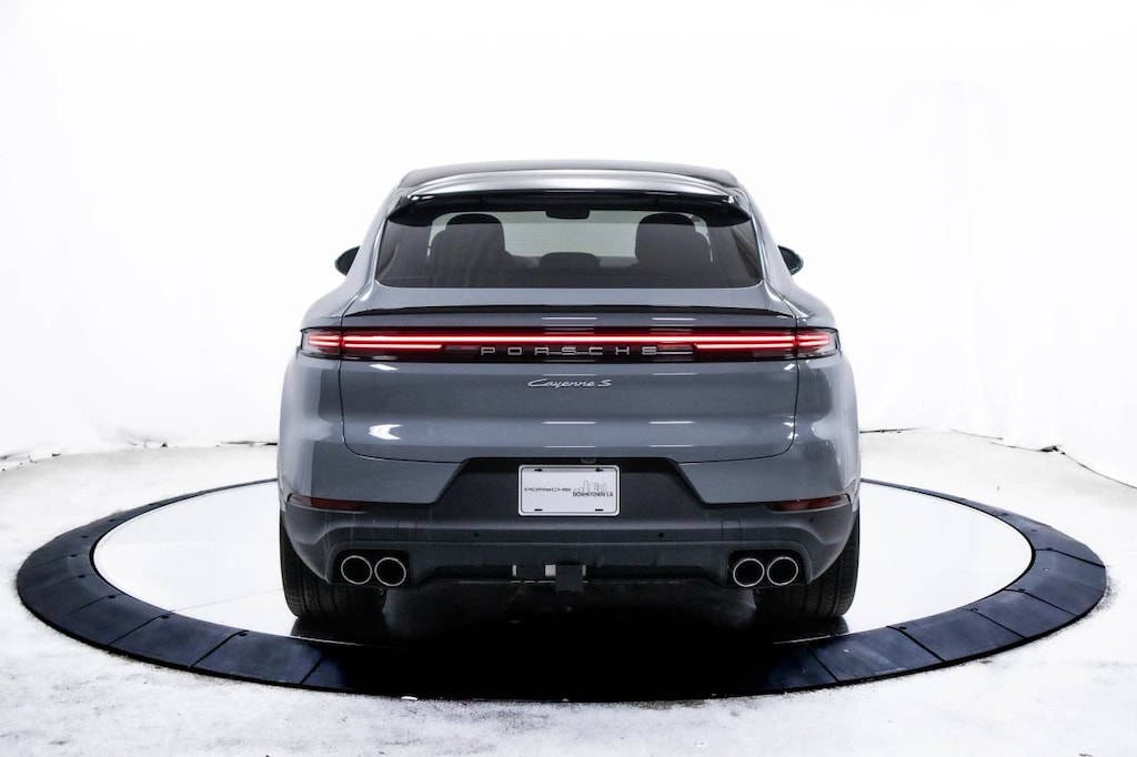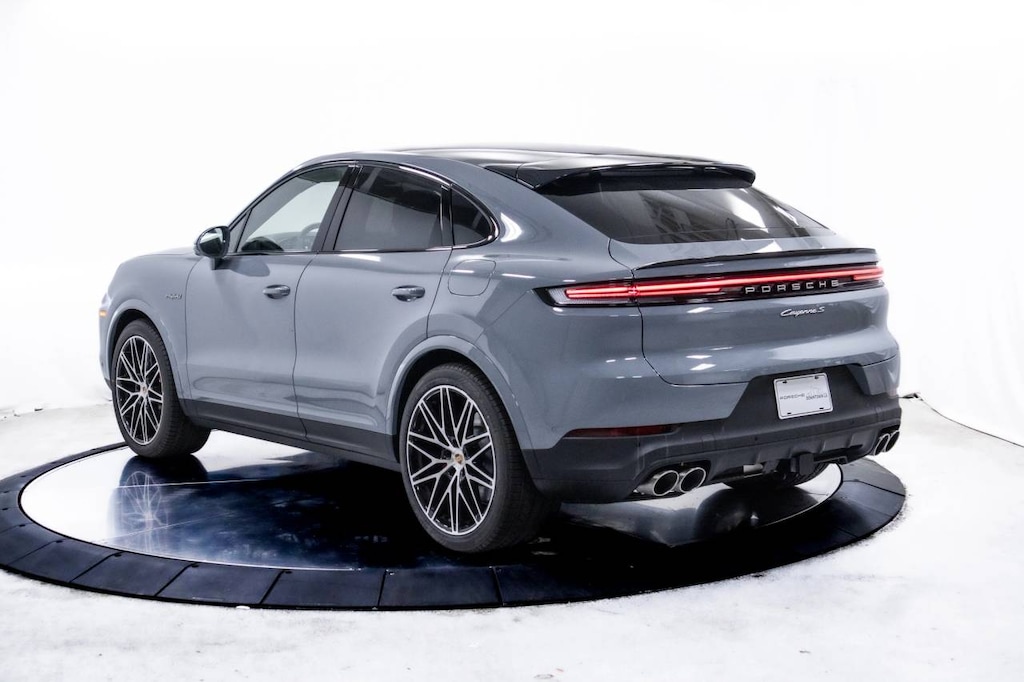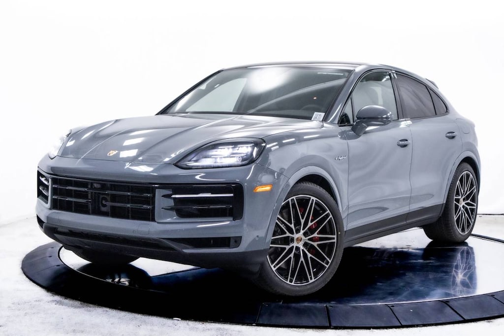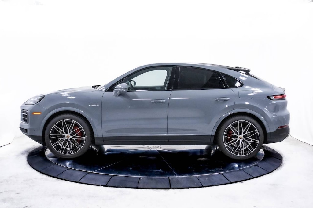 Grey 2025 Porsche Cayenne E-Hybrid Coupe AWD 8-Speed Automatic with Tiptronic 3.0L V6 Plug-In Hybrid Turbocharged 3.0L V6 Plug-In Hybrid Turbocharged, 10 Speakers, 14-Way Power Seats w/Comfort Memory, 4-Wheel Disc Brakes, 4-Zone Climate Control, 8-Way Sport Seats, ABS brakes, Adaptive Cruise Control w/Lane Keep Assist (LKA), Adaptive suspension, Air Conditioning, Air Quality System, Alloy wheels, AM/FM radio: SiriusXM w/360L, Apple CarPlay & Android Auto, Audio memory, Auto-dimming door mirrors, Auto-dimming Rear-View mirror, Auto-leveling suspension, Automatic temperature control, BOSE Surround Sound System, Brake assist, Bumpers: body-color, Compass, Delay-off headlights, Driver door bin, Driver vanity mirror, Dual front impact airbags, Dual front side impact airbags, Electronic Stability Control, Exclusive Design Fuel Cap, Exterior Mirror Lower Trim & Base in Ext Color, Exterior Parking Camera Rear, Four wheel independent suspension, Front anti-roll bar, Front Bucket Seats, Front Center Armrest, Front dual zone A/C, Front reading lights, Front Ventilated Seats, Fully automatic headlights, Garage door transmitter: HomeLink, HD-Matrix Design LED Headlights, Heated door mirrors, Heated front seats, Heated GT Sport Steering Wheel in Leather, Heated steering wheel, HVAC memory, Illuminated entry, Knee airbag, Leather Seat Trim, Leather steering wheel, Low tire pressure warning, Memory seat, Navigation System, Occupant sensing airbag, Outside temperature display, Overhead airbag, Overhead console, Panic alarm, Passenger Display, Passenger door bin, Passenger vanity mirror, Porsche Communication Management, Power door mirrors, Power driver seat, Power Liftgate, Power passenger seat, Power steering, Power Sunblind for Rear Side Windows, Power windows, Premium Package Plus, Radio data system, Rain sensing wipers, Rear anti-roll bar, Rear Comfort Seats (2+1), Rear fog lights, Rear Heated Seats, Rear reading lights, Rear seat center armrest, Rear side impact airbag, Rear window defroster, Remote keyless entry, Roof Spoiler in High Gloss Black, Security system, Speed control, Speed-sensing steering, Split folding rear seat, Spoiler, Steering wheel mounted audio controls, Tachometer, Telescoping steering wheel, Tilt steering wheel, Traction control, Trailer Hitch w/o Tow Ball, Trip computer, Turn signal indicator mirrors, Variably intermittent wipers, Voltmeter, Wheels: 20 Cayenne S in Vesuvius Grey, Wheels: 22 RS Spyder Design, 3.0L V6 Plug-In Hybrid Turbocharged.