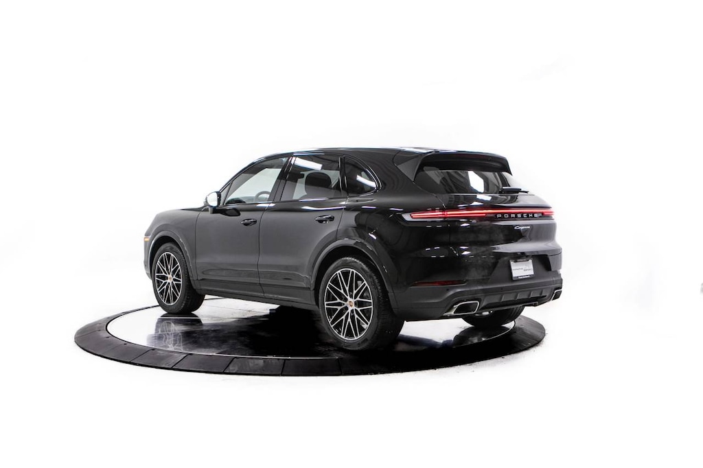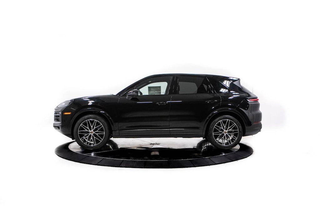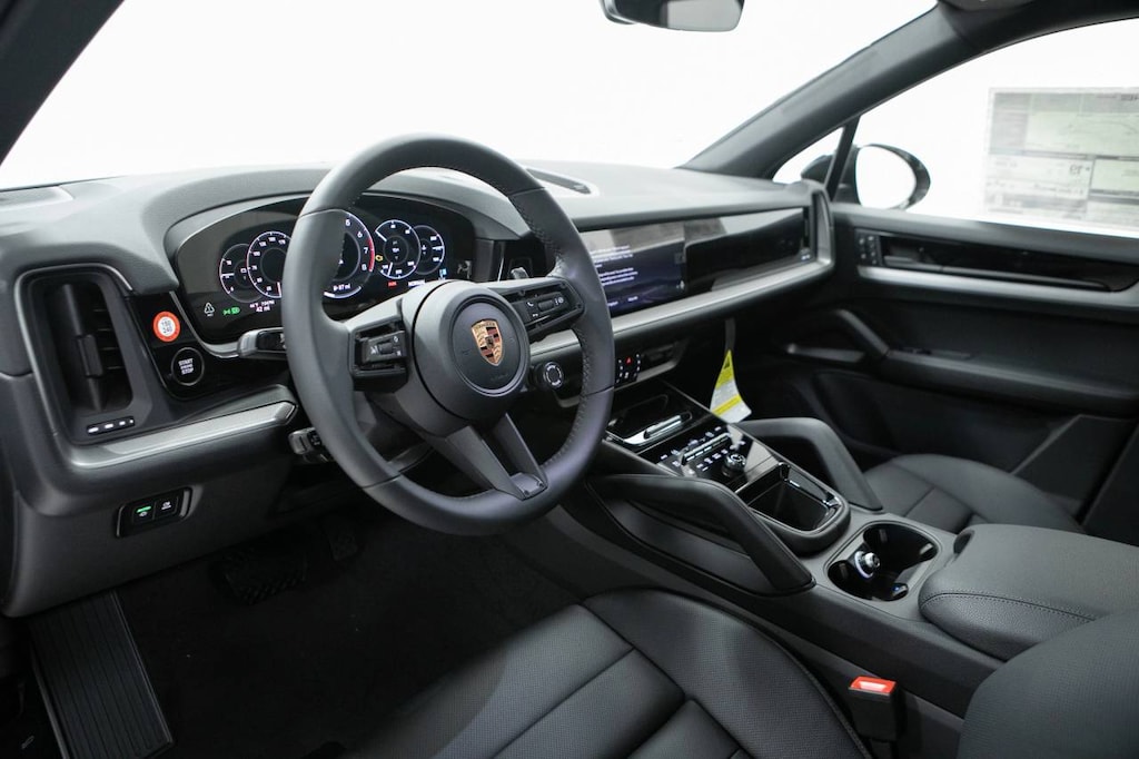 Black 2026 Porsche Cayenne AWD 8-Speed Automatic with Tiptronic 3.0L V6 Black Leather, 10 Speakers, 14-Way Power Seats with Comfort Memory, 4-Wheel Disc Brakes, 8-Way Power Seats, ABS brakes, Adaptive Cruise Control with Lane Keep Assist (LKA), Adaptive suspension, Air Conditioning, Alloy wheels, AM/FM radio: SiriusXM w/360L, Apple CarPlay & Android Auto, Artificial Leather Seat Trim, Audio memory, Auto-dimming door mirrors, Auto-dimming Rear-View mirror, Automatic temperature control, BOSE Surround Sound System, Brake assist, Bumpers: body-color, Compass, Delay-off headlights, Driver door bin, Driver vanity mirror, Dual front impact airbags, Dual front side impact airbags, Electronic Stability Control, Exterior Parking Camera Rear, Four wheel independent suspension, Front anti-roll bar, Front Bucket Seats, Front Center Armrest, Front dual zone A/C, Front reading lights, Front Ventilated Seats, Fully automatic headlights, Garage door transmitter: HomeLink, Heated door mirrors, Heated front seats, Heated GT Sport Steering Wheel in Leather, Heated steering wheel, HVAC memory, Illuminated entry, Knee airbag, Leather steering wheel, Low tire pressure warning, Memory seat, Navigation System, Occupant sensing airbag, Outside temperature display, Overhead airbag, Overhead console, Panic alarm, Panoramic Roof System, Passenger door bin, Passenger vanity mirror, Porsche Communication Management, Power door mirrors, Power driver seat, Power Liftgate, Power passenger seat, Power steering, Power windows, Premium Package, Radio data system, Rain sensing wipers, Rear anti-roll bar, Rear fog lights, Rear Heated Seats, Rear reading lights, Rear seat center armrest, Rear side impact airbag, Rear window defroster, Rear window wiper, Remote keyless entry, Security system, Speed control, Speed-sensing steering, Split folding rear seat, Spoiler, Steering wheel mounted audio controls, Tachometer, Telescoping steering wheel, Tilt steering wheel, Traction control, Trip computer, Turn signal indicator mirrors, Under Door Puddle Light Projectors, Variably intermittent wipers, Voltmeter, Wheels: 20 Cayenne Design, Wheels: 21 RS Spyder Design, Window Trim in High Gloss Black, Black Leather.