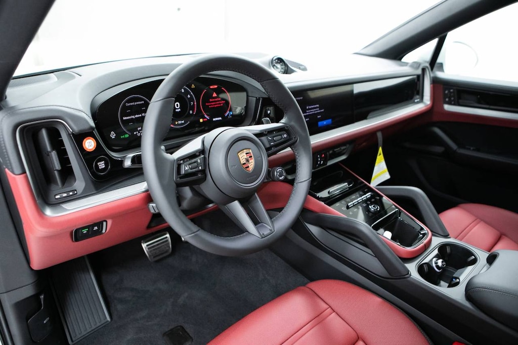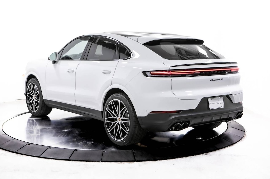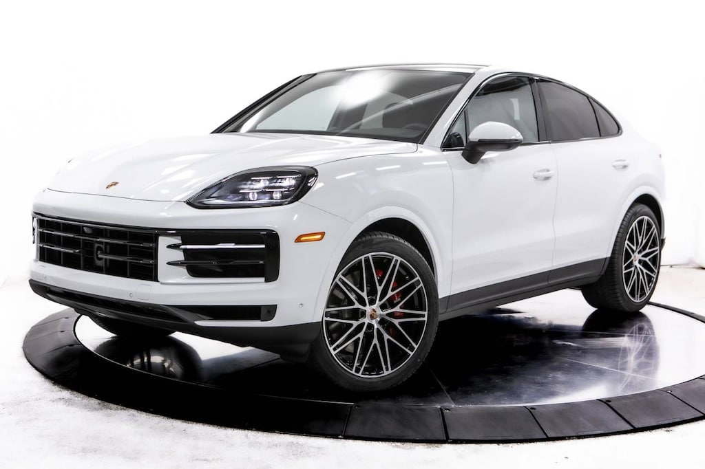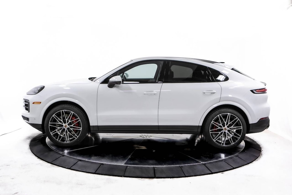 White 2026 Porsche Cayenne Coupe S AWD 8-Speed Automatic with Tiptronic V8 10 Speakers, 14-Way Power Seats w/Comfort Memory, 4-Wheel Disc Brakes, 4-Zone Climate Control, 8-Way Sport Seats, ABS brakes, Adaptive Cruise Control w/Lane Keep Assist (LKA), Adaptive suspension, Air Conditioning, Alloy wheels, AM/FM radio: SiriusXM w/360L, Apple CarPlay & Android Auto, Audio memory, Auto-dimming door mirrors, Auto-dimming Rear-View mirror, Automatic temperature control, BOSE Surround Sound System, Brake assist, Bumpers: body-color, Compass, Delay-off headlights, Driver door bin, Driver vanity mirror, Dual front impact airbags, Dual front side impact airbags, Electronic Stability Control, Exterior Parking Camera Rear, Four wheel independent suspension, Front anti-roll bar, Front Bucket Seats, Front Center Armrest, Front dual zone A/C, Front reading lights, Front Ventilated Seats, Fully automatic headlights, Garage door transmitter: HomeLink, HD-Matrix Design LED Headlights, Heated door mirrors, Heated front seats, Heated GT Sport Steering Wheel in Leather, Heated steering wheel, HVAC memory, Illuminated entry, Knee airbag, Leather Seat Trim, Leather steering wheel, Low tire pressure warning, Memory seat, Navigation System, Occupant sensing airbag, Outside temperature display, Overhead airbag, Overhead console, Panic alarm, Passenger door bin, Passenger vanity mirror, Porsche Communication Management, Porsche Crest on Front Headrests, Porsche Logo & Model Designation on Rear in Black, Power door mirrors, Power driver seat, Power Liftgate, Power passenger seat, Power steering, Power windows, Premium Package Plus, Radio data system, Rain sensing wipers, Rear anti-roll bar, Rear Comfort Seats (2+1), Rear fog lights, Rear Heated Seats, Rear reading lights, Rear seat center armrest, Rear side impact airbag, Rear window defroster, Remote keyless entry, Security system, Speed control, Speed-sensing steering, Split folding rear seat, Spoiler, Sport Tailpipes in Dark Bronze, Steering wheel mounted audio controls, Tachometer, Telescoping steering wheel, Tilt steering wheel, Traction control, Trip computer, Turn signal indicator mirrors, Under Door Puddle Light Projectors, Variably intermittent wipers, Voltmeter, Wheels: 20 Cayenne S in Vesuvius Grey, Wheels: 22 RS Spyder Design.
