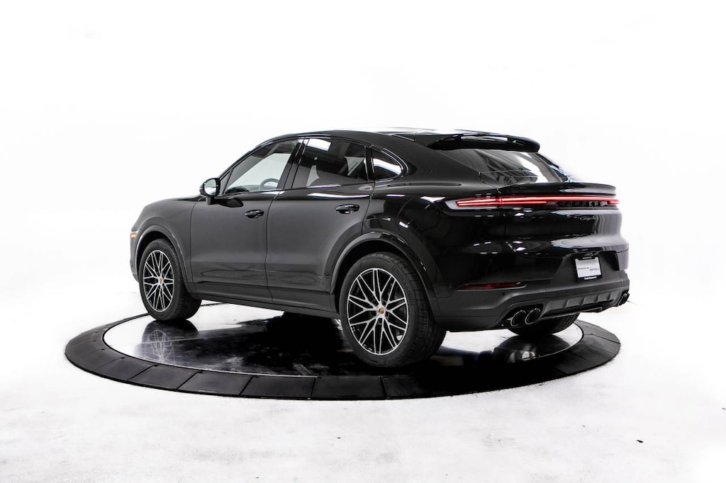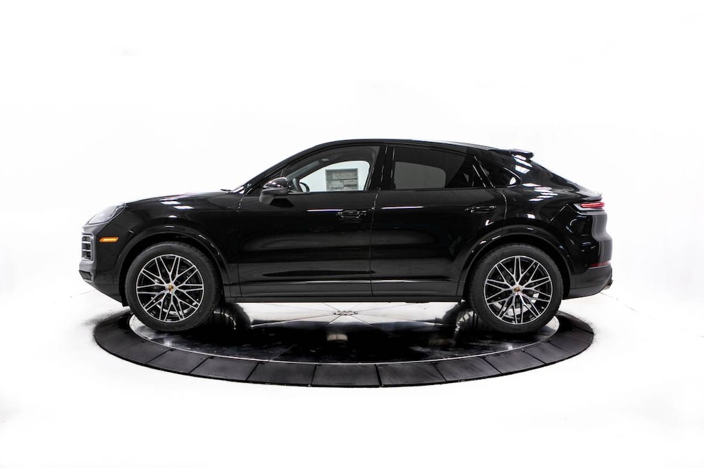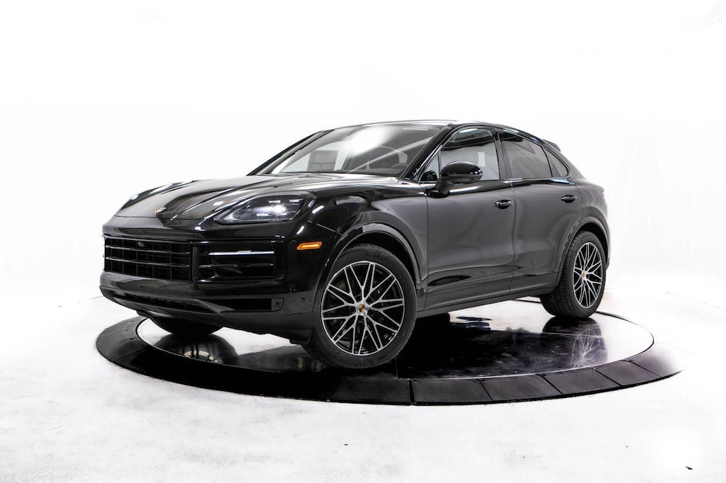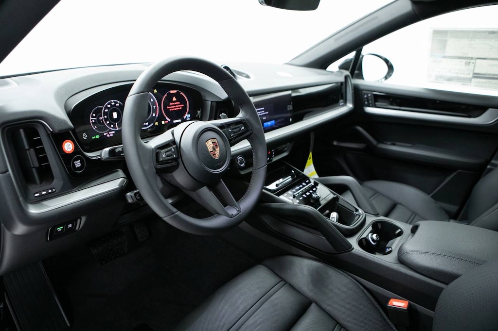 Black 2026 Porsche Cayenne Coupe AWD 8-Speed Automatic with Tiptronic 3.0L V6 10 Speakers, 14-Way Power Seats w/Comfort Memory, 4-Wheel Disc Brakes, 8-Way Sport Seats, ABS brakes, Adaptive suspension, Air Conditioning, Alloy wheels, AM/FM radio: SiriusXM w/360L, Apple CarPlay & Android Auto, Audio memory, Auto-dimming door mirrors, Auto-dimming Rear-View mirror, Automatic temperature control, BOSE Surround Sound System, Brake assist, Bumpers: body-color, Compass, Delay-off headlights, Driver door bin, Driver vanity mirror, Dual front impact airbags, Dual front side impact airbags, Electronic Stability Control, Exterior Parking Camera Rear, Four wheel independent suspension, Front anti-roll bar, Front Bucket Seats, Front Center Armrest, Front dual zone A/C, Front reading lights, Front Ventilated Seats, Fully automatic headlights, Garage door transmitter: HomeLink, Heated door mirrors, Heated front seats, Heated GT Sport Steering Wheel in Leather, Heated steering wheel, HVAC memory, Illuminated entry, Knee airbag, Leather Seat Trim, Leather steering wheel, Low tire pressure warning, Memory seat, Navigation System, Occupant sensing airbag, Outside temperature display, Overhead airbag, Overhead console, Panic alarm, Passenger door bin, Passenger vanity mirror, Porsche Communication Management, Porsche Crest on Front Headrests, Porsche Logo on Rear in High Gloss Black, Power door mirrors, Power driver seat, Power Liftgate, Power passenger seat, Power steering, Power windows, Radio data system, Rain sensing wipers, Rear anti-roll bar, Rear Comfort Seats (2+1), Rear fog lights, Rear reading lights, Rear seat center armrest, Rear side impact airbag, Rear window defroster, Remote keyless entry, Security system, Speed control, Speed-sensing steering, Split folding rear seat, Spoiler, Sport Tailpipes in Dark Bronze, Steering wheel mounted audio controls, Tachometer, Telescoping steering wheel, Tilt steering wheel, Traction control, Trip computer, Turn signal indicator mirrors, Variably intermittent wipers, Voltmeter, Wheels: 20 Cayenne Design, Wheels: 21 RS Spyder Design.