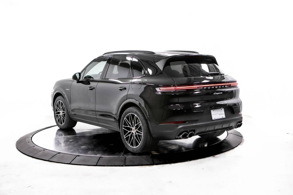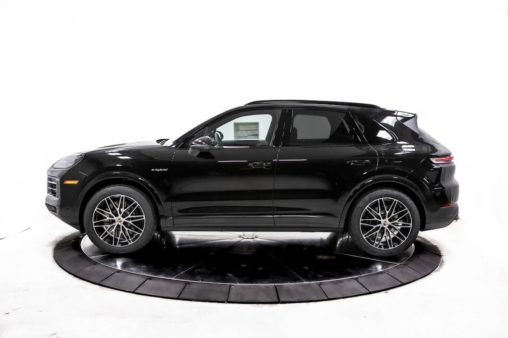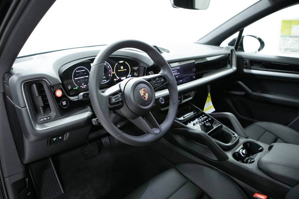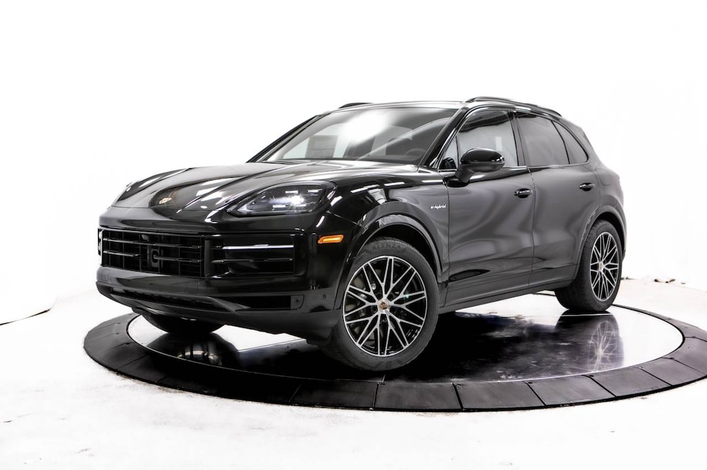 Black 2026 Porsche Cayenne E-Hybrid AWD 8-Speed Automatic with Tiptronic 3.0L V6 Plug-In Hybrid Turbocharged 3.0L V6 Plug-In Hybrid Turbocharged, 10 Speakers, 14-Way Power Seats w/Comfort Memory, 4-Wheel Disc Brakes, 8-Way Power Seats, ABS brakes, Adaptive Cruise Control w/Lane Keep Assist (LKA), Adaptive suspension, Air Conditioning, Alloy wheels, AM/FM radio: SiriusXM w/360L, Apple CarPlay & Android Auto, Audio memory, Auto-dimming door mirrors, Auto-dimming Rear-View mirror, Automatic temperature control, BOSE Surround Sound System, Brake assist, Bumpers: body-color, Compass, Delay-off headlights, Driver door bin, Driver vanity mirror, Dual front impact airbags, Dual front side impact airbags, Electronic Stability Control, Embossed Leather Seat Trim, Exterior Parking Camera Rear, Four wheel independent suspension, Front anti-roll bar, Front Bucket Seats, Front Center Armrest, Front dual zone A/C, Front reading lights, Front Ventilated Seats, Fully automatic headlights, Garage door transmitter: HomeLink, Heated door mirrors, Heated front seats, Heated GT Sport Steering Wheel in Leather, Heated steering wheel, HVAC memory, Illuminated entry, Knee airbag, Leather steering wheel, Low tire pressure warning, Memory seat, Navigation System, Occupant sensing airbag, Outside temperature display, Overhead airbag, Overhead console, Panic alarm, Panoramic Roof System, Passenger door bin, Passenger vanity mirror, Porsche Communication Management, Porsche Crest on Front Headrests, Power door mirrors, Power driver seat, Power Liftgate, Power passenger seat, Power steering, Power windows, Premium Package, Radio data system, Rain sensing wipers, Rear anti-roll bar, Rear fog lights, Rear Heated Seats, Rear reading lights, Rear seat center armrest, Rear side impact airbag, Rear window defroster, Rear window wiper, Remote keyless entry, Roof Rails in Black Aluminum Finish, Security system, Speed control, Speed-sensing steering, Split folding rear seat, Spoiler, Sport Tailpipes in Silver, Steering wheel mounted audio controls, Tachometer, Telescoping steering wheel, Tilt steering wheel, Traction control, Trip computer, Turn signal indicator mirrors, Under Door Puddle Light Projectors, Variably intermittent wipers, Voltmeter, Wheels: 20 AeroDesign, Wheels: 21 RS Spyder Design, Window Trim in High Gloss Black, 3.0L V6 Plug-In Hybrid Turbocharged.