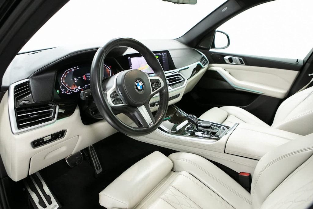 CARFAX One-Owner. Ivory White Leather, 10 Speakers, 4-Wheel Disc Brakes, ABS brakes, Air Conditioning, Alloy wheels, AM/FM radio: SiriusXM with 360L, AM/FM Stereo, Apple CarPlay & Android Auto Compatibility, Apple CarPlay Compatibility, Auto High-beam Headlights, Auto tilt-away steering wheel, Auto-dimming door mirrors, Auto-dimming Rear-View mirror, Automatic temperature control, Axle Ratio: 3.385, BMW Assist eCall, BMW TeleServices, Brake assist, Bumpers: body-color, Compass, Connected Package Pro, ConnectedDrive Services, Delay-off headlights, Driver door bin, Driver vanity mirror, Dual front impact airbags, Dual front side impact airbags, Electronic Stability Control, Emergency communication system: BMW Assist eCall, Exterior Parking Camera Rear, Four wheel independent suspension, Front anti-roll bar, Front Bucket Seats, Front Center Armrest, Front dual zone A/C, Front fog lights, Front reading lights, Fully automatic headlights, Garage door transmitter, Genuine wood console insert, Genuine wood dashboard insert, Genuine wood door panel insert, Head restraints memory, Heated door mirrors, Heated Front Seats, Heated front seats, Hi-Fi Sound System, Illuminated entry, Knee airbag, Leather Shift Knob, Leather steering wheel, Live Cockpit Pro w/Navigation, Low tire pressure warning, Lumbar Support, Memory seat, Navigation System, Occupant sensing airbag, Outside temperature display, Overhead airbag, Panic alarm, Passenger door bin, Passenger vanity mirror, Power adjustable front head restraints, Power door mirrors, Power driver seat, Power Front Seats, Power moonroof, Power passenger seat, Power steering, Power windows, Radio data system, Rain sensing wipers, Rear air conditioning, Rear anti-roll bar, Rear reading lights, Rear seat center armrest, Rear window defroster, Rear window wiper, Remote keyless entry, Roof rack: rails only, Security system, SensaTec Upholstery, Speed control, Speed-sensing steering, Speed-Sensitive Wipers, Split folding rear seat, Spoiler, Sport Seats, Sport steering wheel, Steering wheel memory, Steering wheel mounted audio controls, Tachometer, Telescoping steering wheel, Tilt steering wheel, Traction control, Trip computer, Turn signal indicator mirrors, Variably intermittent wipers, Wheels: 19 x 9 V-Spoke (Style 734), Ivory White Leather. Odometer is 26213 miles below market average! Black Sapphire Metallic 2021 BMW X5 xDrive40i xDrive40i AWD 8-Speed Automatic Sport 3.0L I6 DOHC 24V TwinPower Turbo